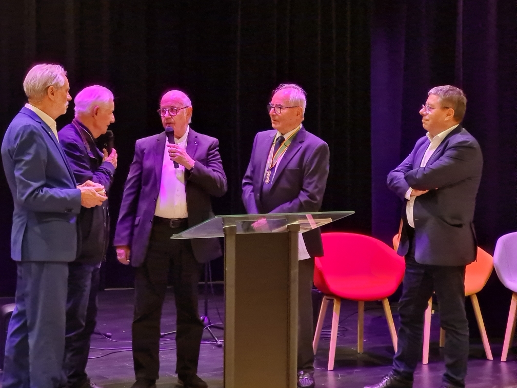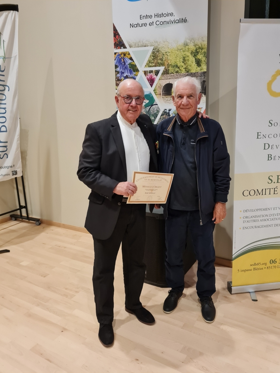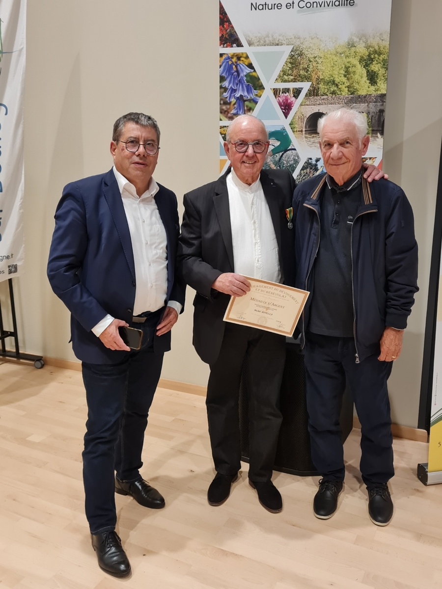 Photos : Michel BOTELLA lors de la remise de la médaille d’argent aux Lucs sur Boulogne, accompagné par Joël POIRAUD et Rémi PASCREAU, maire de Challans